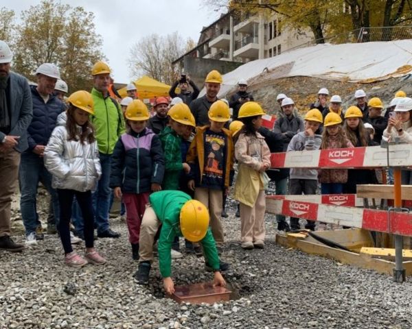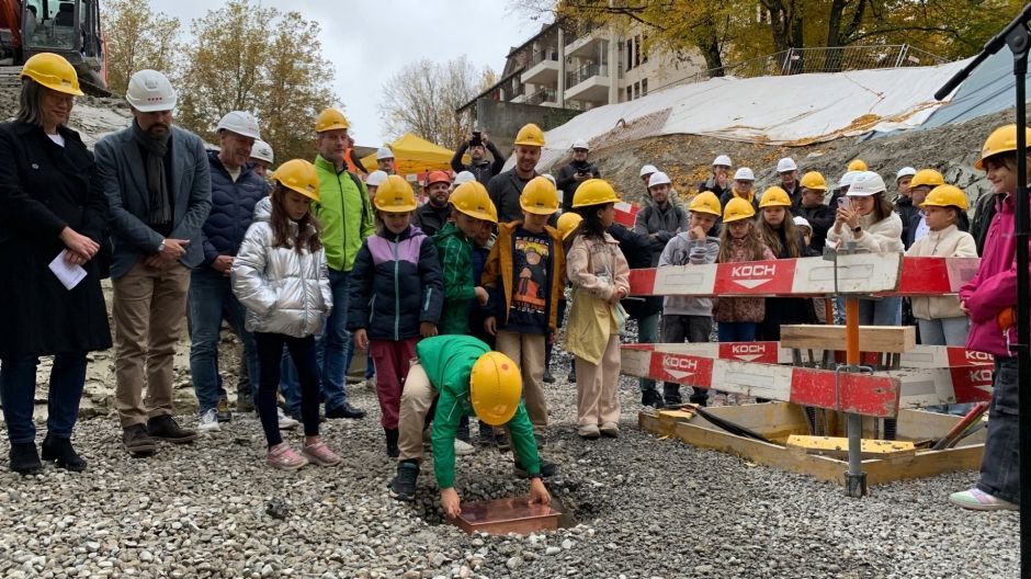 Mit der Grundsteinlegung wurde heute ein wichtiger Meilenstein erreicht und mit den Projektbeteiligte, Vertretende aus der Nachbarschaft, Mitglieder der IG Hallenbad Blumenwies, Schulräte, Schulkinder und Lehrpersonen gefeiert.